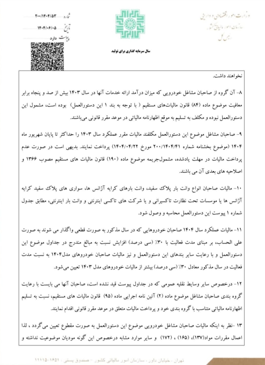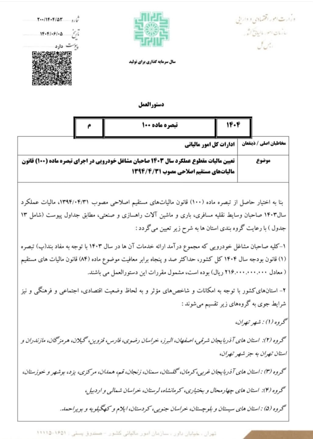 دستورالعمل تعیین مالیات مقطوع عملکرد سال 1403 صاحبان مشاغل خودرویی در اجرای تبصره ماده 100 قانون مالیاتهای مستقیم مصوب 1394/04/31