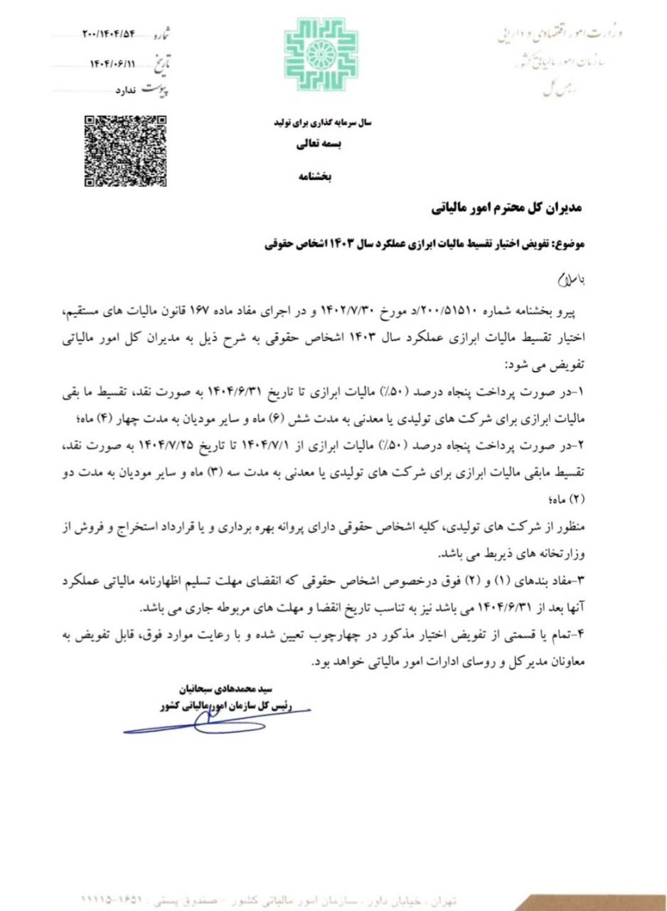 شماره بخشنامه: 200/1404/54تاریخ بخشنامه : 1404/06/11