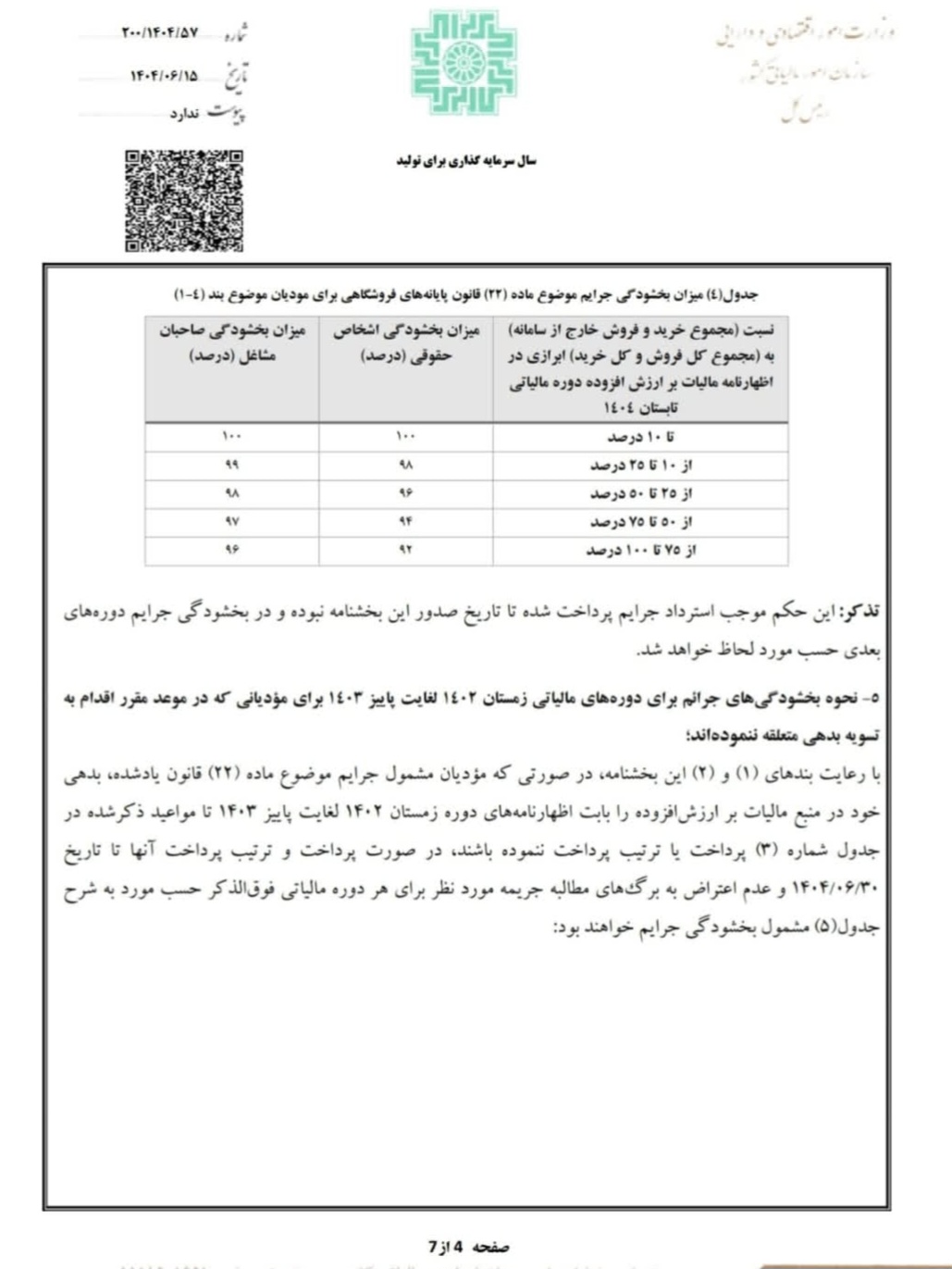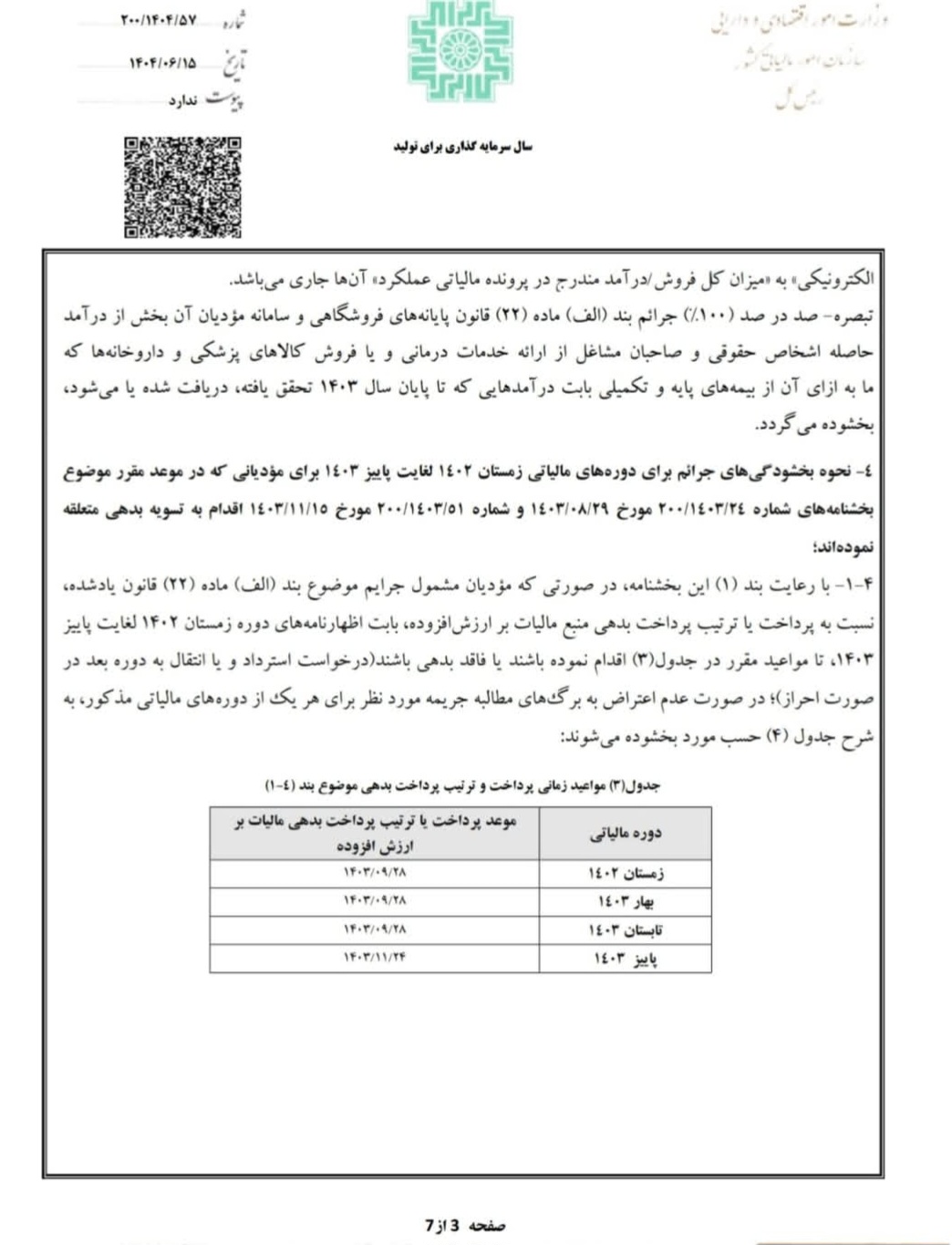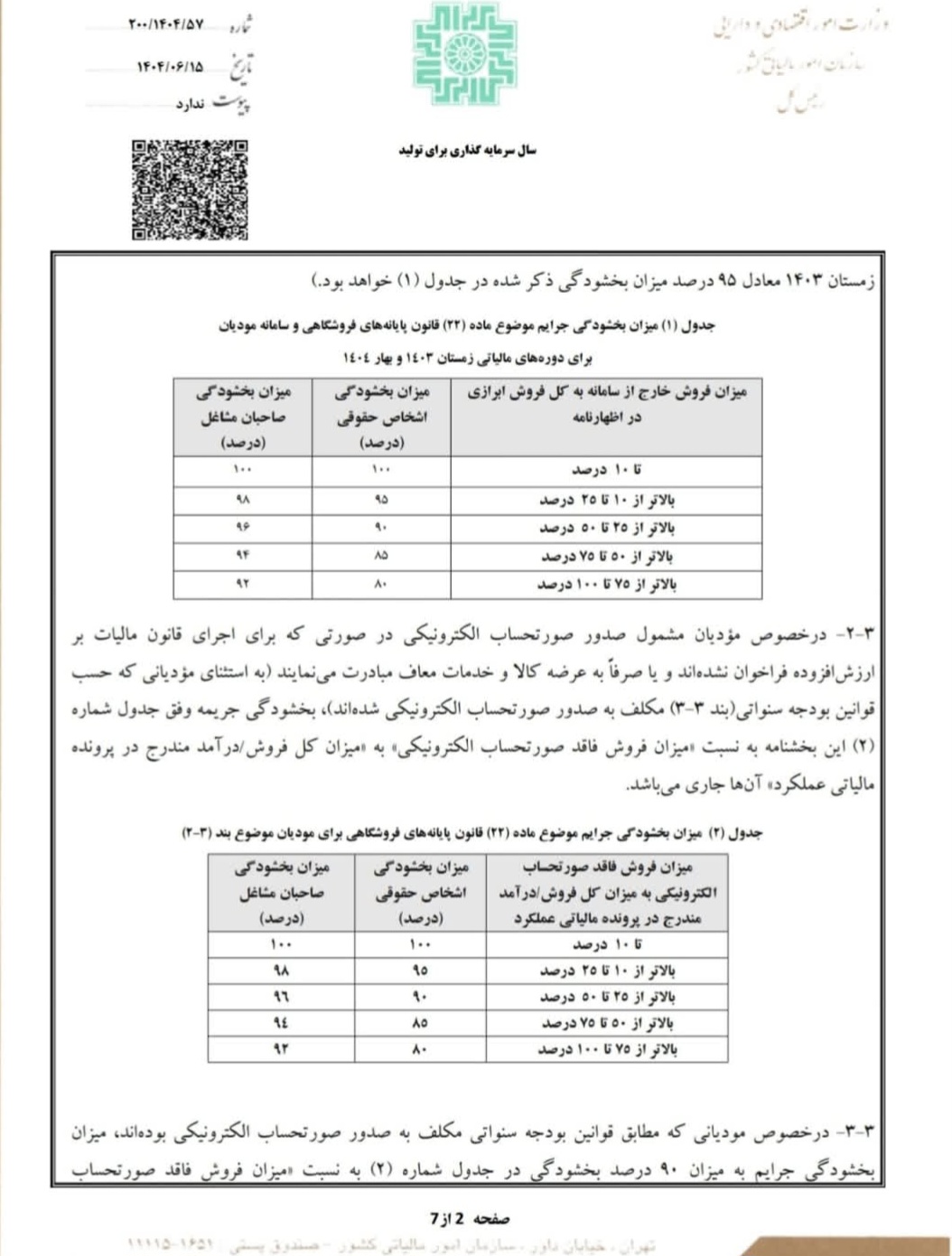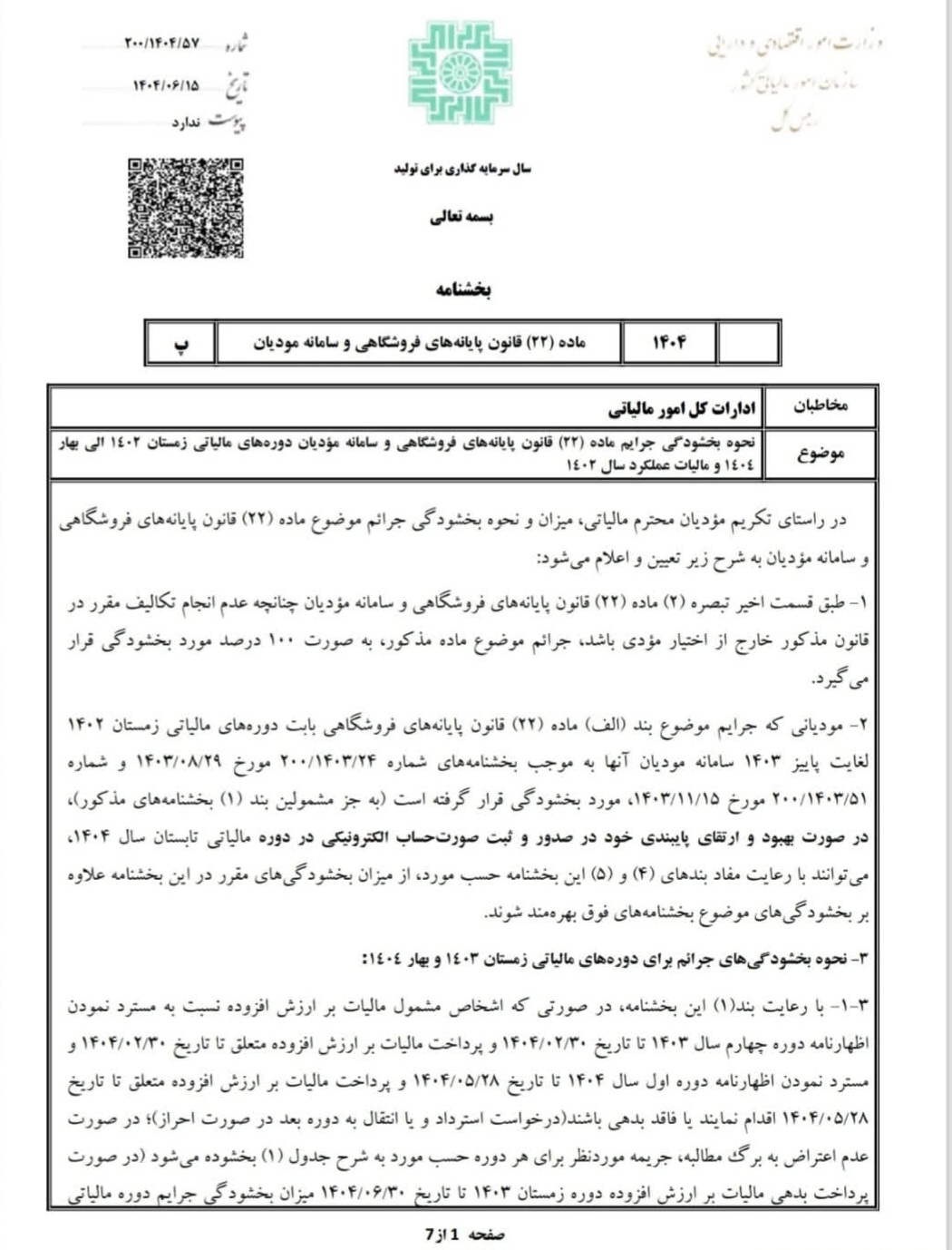 بخشنامه نحوه بخشودگی جرایم ماده 22 قانون پایانههای فروشگاهی و سامانه مودیان دورههای زمستان 1402 تا بهار 1404 و مالیات عملکرد سال 1402