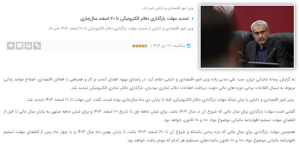 همچنین مهلت بارگذاری برای سال مالی که بازه زمانی یکساله و شروع آن تا 30 اسفند 1403 باشد، تا پایان بهمن ماه سال 1404 و یا چهار ماه پس از انقضای مهلت تسلیم اظهارنامه مالیاتی موضوع مواد 100 و 110 قانون مالیاتهای مستقیم هر کدام که موخر باشد، خواهد بود.