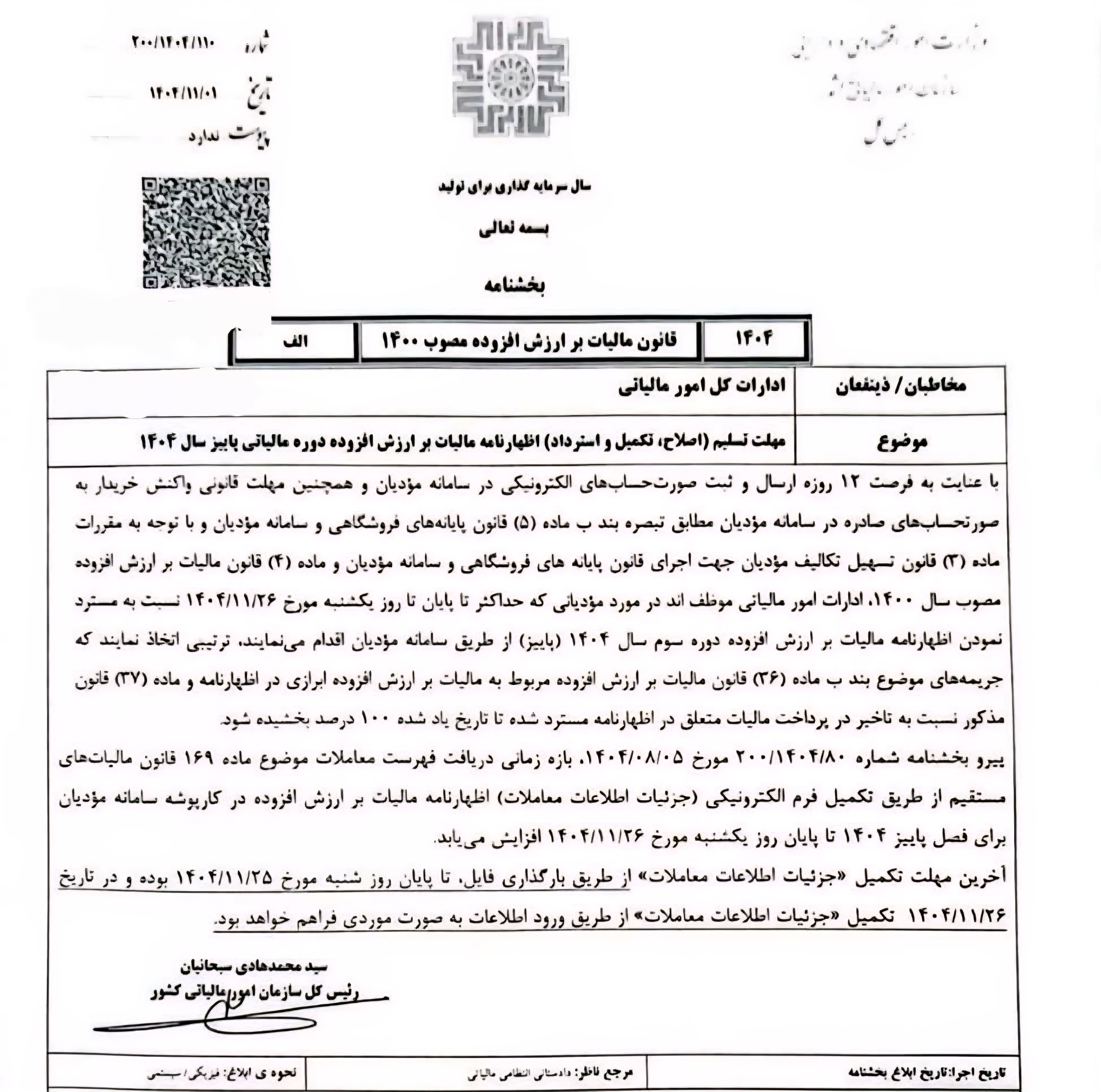 بخشنامه تمدید مهلت اصلاح، تکمیل و استرداد اظهارنامه ارزش افزوده پاییز ۱۴۰۴ و پرداخت آن تا ۲۶ بهمن ماه و بخشودگی صددرصدیِ جرائم آن